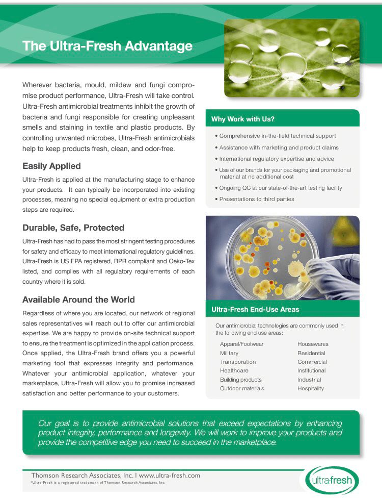 If your business produces products that require freshness protection against odour causing microbes or protection against mould and mildew – the solution could be Ultra-Fresh.